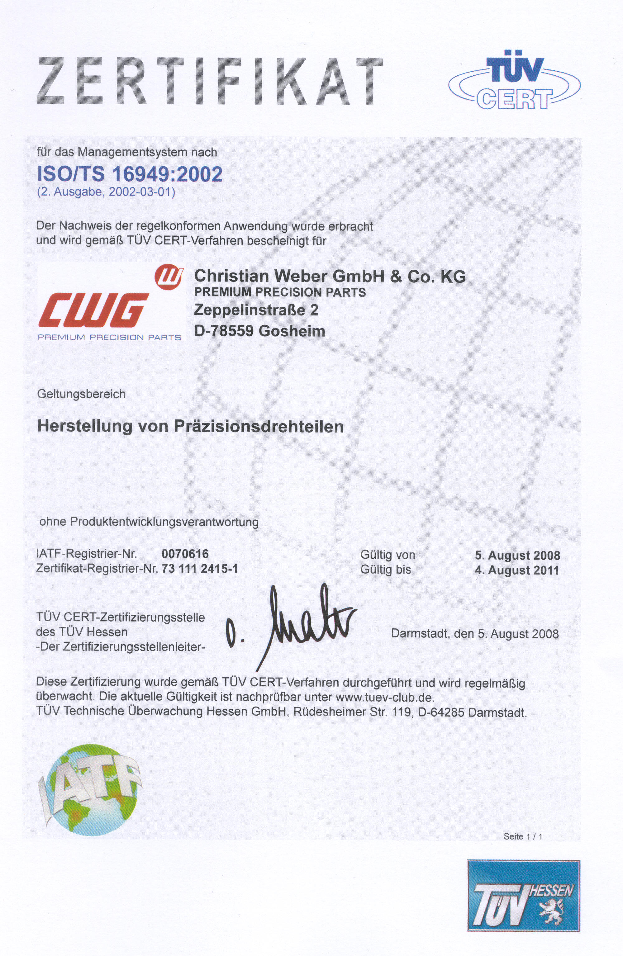 Die Firma CWG Christian Weber Präzisionstechnik mit Sitz in Gosheim ist ein Familienunternehmen in dritter Generation und beschäftigt sich seit fast 100 Jahren mit der Herstellung von Präzisionsdrehteilen. Mit mehr als 300 Mitarbeitern produzieren wir an zwei Standorten Qualität in Kleinserie, Mittelserie und Großserie. Das Produktportfolio reicht von hochgenauen Kolben und Steuerschiebern für Hydraulikventile, über Hülsen und Düsen mit komplexer Innen- und Außenkontur bis hin zu präzisen Teilen für Einspritzsysteme der Automobilindustrie in Millionenstückzahlen. Toleranzen im Bereich von +/-0,00075 am Durchmesser sowie Zylinderform von 0,001 gehören ebenso zu unseren Stärken wie Bohrungen mit Toleranzen von +/-0,002. Eine hohe Fertigungstiefe mit Oberflächenbehandlung (verzinken, hartverchromen, eloxieren usw.) oder Wärmebehandlungsverfahren (einsatzhärten, induktivhärten, nitrocarburieren oder carbonitrieren) ist hierbei Standard. Namhafte Kunden aus allen Bereichen bestätigen unser Know-How durch Auszeichnungen wie „Entwicklungslieferant“, „A-Lieferant“ oder „Vorzugslieferant“. Der Maschinenpark ist ausgestattet mit Langdrehern, Kurzdrehern , Mehrspindeldrehmaschinen, Bearbeitungszentren sowie Schleifmaschinen für alle Arten von Schleifarbeitsgängen. Ergänzt wird dies durch mehrere Weiterbearbeitungs- sowie Montagearbeitsplätze für Baugruppen. Durch die Maschinenvielzahl können wir alle aktuellen Fertigungsverfahren wie drehen, hartdrehen, honen, durchgangschleifen, einstechschleifen, glattwalzen oder auch innenräumen realisieren. Erfahrung im Zerspanen haben wir mit fast jedem Werkstoff angefangen bei Automatenstahl (11SMn30) über Silberstähle (115CrV3), hochlegierte Stähle (1.4104, 1.4305, 1.4021, 1.4034, 1.4401 oder 1.4571), Kugellagerstähle (100Cr6) und Schnellarbeitsstahl (1.3343) bis hin zu Messing, Alu und Kunststoff. In Sachen Qualität ist die Zertifizierung nach TS 16949:2002 ebenso selbstverständlich wie ein Umweltmanagement nach ISO 14001:2005. Dank einem bereichsübergreifenden LEAN MANAGEMENT System, welches seit 2007 kontinuierlich ausgebaut wird, haben wir uns trotz unserer Größe ein hohes Maß an Flexibilität gesichert. Wir sind bereit für die Zukunft, testen Sie uns!