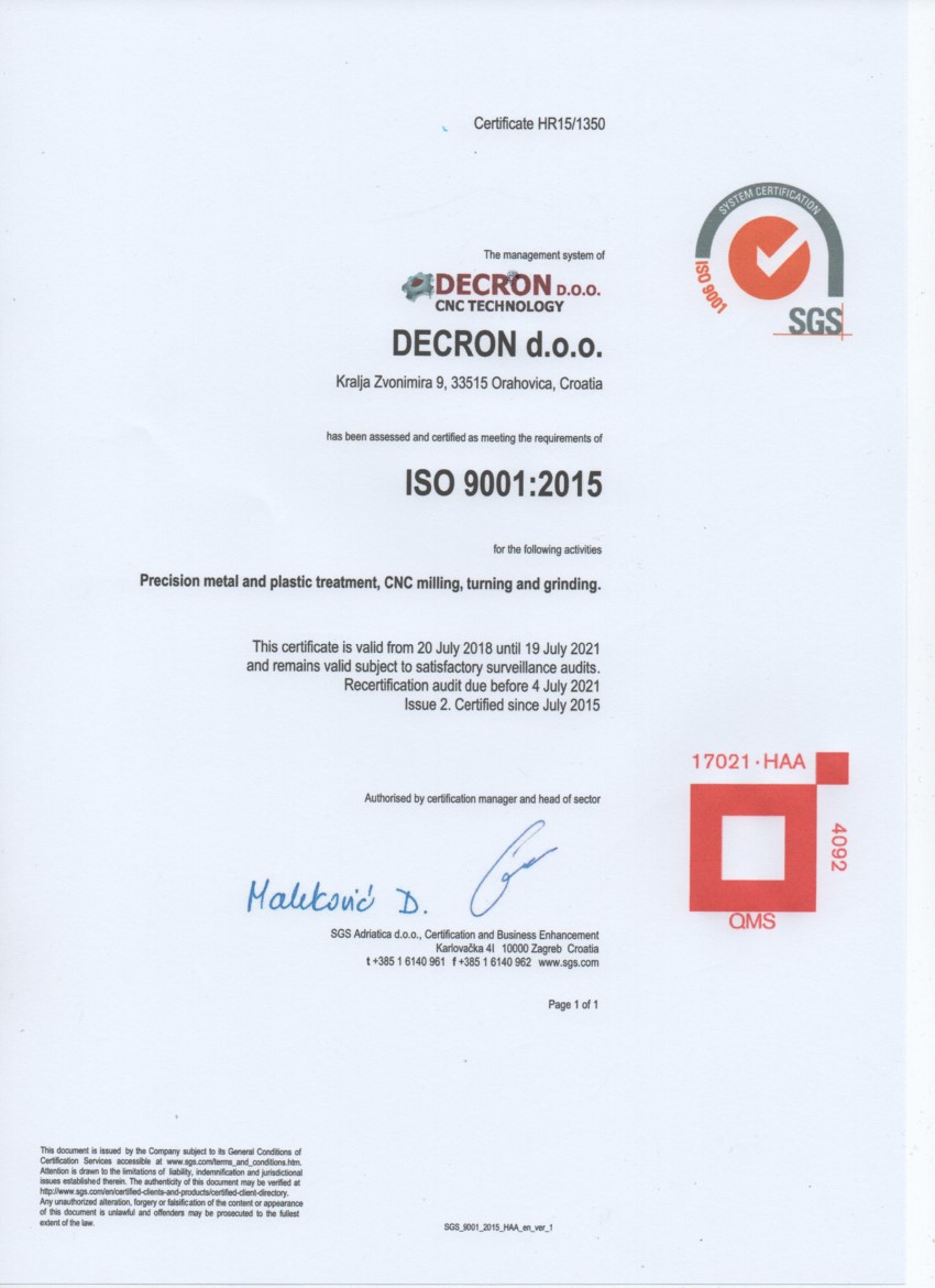 Wir sind ein Lohnfertiger Unternehmen mit 20 Angestellten (1 Ingenieure Mechatronik, 2 Ingenieure Maschinenbau, 17 Kvalifizierte Arbeitskraefte + 4 Auszubildende + 1 Aushilfskraft bei Bedarf). Wir produzieren hochpräzise Metal und Kunstoff Teile. (CNC Fräsen / CNC Drehen / NC Flachschleifen) Zertifikat DIN 9001:2015 vorhanden. In den letzten 12 Monaten haben wir ueber 20000 Präzisions Teile darunter ca.200 verschiedene Teile, (Hydraulik, Optik, Maschinenbau alg., Automobilindustrie ) gefertigt und geliefert. Wir sind bereit Klein- als auch Großserien-Aufträge anzunehmen und sowohl qualitativ als auch Termingerecht, Hochpräzise Teile zu liefern. Wir waehren auch bereit in neue Maschinen und Tehnologien zu investieren wen das gefordert wird. Unseres Angebot umfasst:5 ACHSEN SIMULTAN CNC Fraesen, 3 Achs CNC Fraesen, CNC Drehen m. angetriebenen Werkzeugen, Bohren, Gewindeschneiden, Entgraten, Trowalisieren, Flachschleifen. (Oberflächenbehandlungen durch unsere Kooperationspartner) wie Eloxieren, Harteloxieren, Vernickeln, Chromatieren, Härten, Brunieren. Desweiteren können wir noch Montagearbeiten von Baugruppen, sowie Schweißen von kleineren Konstruktionen anbieten. Wir fertigen schon fur mehrere grosse und Mittelständische Betriebe in Deutschland und der Schweiz und diese Zusammenarbeit funktioniert auf beidseitige Zufriedenheit sehr gut. Geliefert wird nach Bedarf mit eigenem Kombi, Paketpost oder mit einem Transportunternehmen. ZUKUNFTSPLAENE: Im Jahr 2019 werden wir in eine Neue Produktionshalle umziehen, es kommt ein Neues 5-Achs Bearbeitungszentrum und 2 neue CNC-Drehmaschinen dazu, so werden wir noch mehr Kapazitaetten Mit freundlichen Grüßen Drazen Snjaric DECRON d.o.o. Tel:+385922471395 UStIdN.: HR36388333040 DUNS Nummer: 595554641