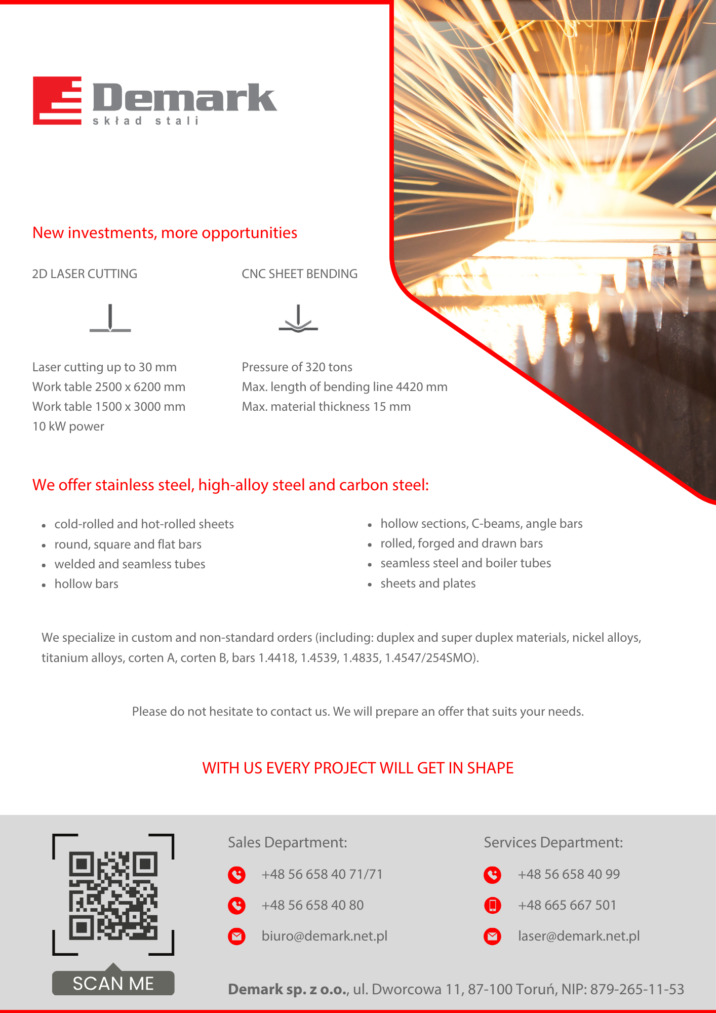 Unser Unternehmen, das seit über 30 Jahren auf dem Markt ist, hat sich auf die Lieferung von rostfreiem Stahl, hitzebeständigem Stahl sowie Nickel- und Titanlegierungen spezialisiert. Wir bieten eine breite Palette von Produkten und Dienstleistungen an, die auf die spezifischen Bedürfnisse von großen Investitionen und ungewöhnlichen Aufträgen zugeschnitten sind. Unser Portfolio umfasst unter anderem warm- und kaltgewalzte Bleche, nahtlose und geschweißte Rohre, gezogene und gewalzte Stäbe sowie eine breite Palette von Profilen und Formteilen. Wir sind auch auf Duplex-, Super-Duplex- und Lean-Duplex-Stähle spezialisiert. Chemieanlagen, petrochemische Anlagen, Raffinerien, Kraftwerke, Werften sowie Bau- und Montageunternehmen sind nur einige der Branchen, die wir mit Produkten höchster Qualität beliefern. Entdecken Sie unser Angebot an spezialisierten Stahlverarbeitungsdiensten. Wählen Sie unten, um mehr zu erfahren. Wir lieben Herausforderungen. Die Bearbeitung von Aufträgen mit ungewöhnlichen Abmessungen und Güten ist unser Standard. Über 30 Jahre Erfahrung in Schlüsselindustrien für die Wirtschaft, die Zusammenarbeit nur mit anerkannten Herstellern und Stahllagern aus der ganzen Welt sowie die Garantie für pünktliche Lieferungen und professionelle technische Unterstützung - das sind die Grundlagen unseres Marktvertrauens. Wir setzen auf Qualität. Wir arbeiten mit 185 geprüften Stahlherstellern zusammen. Unsere Produkte und Dienstleistungen sind eine Garantie für höchste Qualität, die durch die ständige Zusammenarbeit mit führenden Industrien in Polen und Europa bestätigt wird. Wir verfügen über einen hochmodernen Maschinenpark mit 10-kW-Laserschneidern. Unsere Arbeitsstationen ermöglichen das Schneiden von großformatigen Blechen mit unterschiedlichen Spezifikationen. Möglichkeiten der Materialstärke Edelstahl und Kohlenstoffstahl bis zu 30 mm Aluminium bis zu 30 mm Messing bis zu 15 mm Kupfer bis zu 12 mm Wir bieten professionelles Abkantpressen, das eine präzise Formgebung von Metallteilen in einer Vielzahl von Formen ermöglicht. Wir arbeiten mit der modernen Abkantpresse TruBend 5320 von Trumpf, die eine Presskraft von 3200 kN und eine maximale Biegelänge von bis zu 4420 mm aufweist. Das garantiert höchste Qualität und Wiederholgenauigkeit.