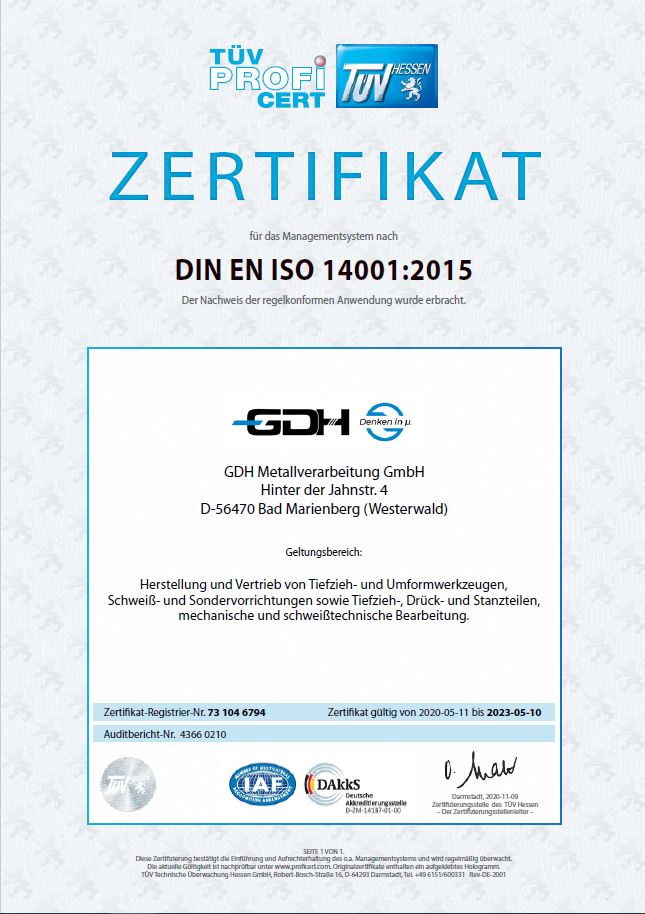Werkzeuge von GDH Benötigen Sie intelligente Werkzeuglösungen oder die Realisierung von komplizierten Bearbeitungsproblemen? Von der Planung und Konstruktion über die Entstehung der Einzelkomponenten bis hin zum Bau des fertigen Werkzeuges: GDH ist seit 1992 kompetenter Partner in der Konstruktion und Herstellung von Werkzeugen für die Blechbearbeitung. Unsere Stärken sind Tiefziehwerkzeuge insbesondere, wenn mehrere Züge erforderlich werden. Werkzeuge fertigen wir als Einlege-, Folge-, Folgeverbund- und Transferwerkzeuge, sowohl für Prototypen, als auch für die Serienfertigung bis zu einem maximalen Gewicht von 10 to. Tiefziehteile von GDH Wir fertigen für Sie Ziehteile aus allen umformtechnisch zu verarbeitenden Werkstoffen. Materialien wie Stahl, Edelstahl und NE-Metalle werden bei uns in die richtige Form gebracht. Dabei ist die Verarbeitung bei Materialstärken von 0,3 mm - 10 mm Stärke bis zu einem Druckbereich von 800 to möglich. Wir fertigen nach Ihren Zeichnungen, aus CAD-Daten und nach Ihren Mustern. Ihre Werkzeuge werden übernommen oder in unserem Hause hergestellt. Zusätzlich bieten wir die Möglichkeit der Tiefziehsimulation bei Einfachzügen in unserem Haus. Drückteile von GDH Bei uns erhalten Sie Drückteile aus allen umformtechnisch zu verarbeitenden Werkstoffen. Materialien wie Kupfer, Messing, Stahl, Aluminium, Edelstahl, Zinn und Zink werden bei uns in die richtige Form gebracht. Rotationssymmetrische Werkstücke werden bis zu einer Rondengröße von 800 mm im Durchmesser bei einer Ausgangsblechstärke von 6 mm in St, 4 mm in VA, 8 mm in CU/CnZu oä. und 10 mm in Al als Drückteile gefertigt. Wir fertigen nach Ihren Zeichnungen, aus CAD-Daten und nach Ihren Mustern. Ihre Werkzeuge werden übernommen oder in unserem Hause hergestellt. Lasertechnik bei GDH Lasern: Wir lasern in 2D-Technik in möglichen Größen 3000 x 1500 mm. maximale Dicke * in VA bis 12 mm * in St bis 20 mm * in Al bis 6 mm In 3D-Technik sind Fahrwege von Größen 3200 x 1525 x 600 mm möglich. Maximale Dicke hier * in VA bis 4 mm * in St bis 8 mm * in Al bis 3 mm Stanztechnik bei GDH Stanzen: Bis zu einer Druckleistung von 120 to vom Band. Bis zu 800 to im Einlegeverfahren.