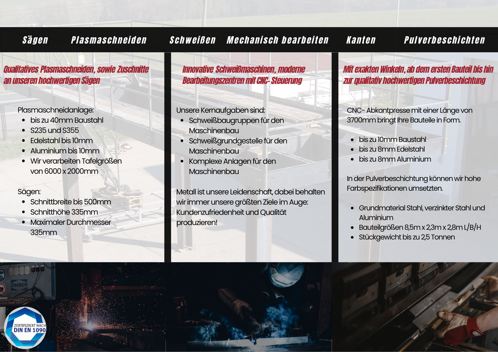 Sie sind auf der Suche nach einem zuverlässigen Partner im Bereich Metallbau, Metallverarbeitung ? Auf einer Fläche von 1.800 m² fertigen wir individuelle Sonderanfertigungen für Privatkunden sowie Schweißbaugruppen für den Maschinen- und Anlagenbau. Dabei setzen wir auf konventionelle Produktion und CNC-Technik. Vorrangig verarbeiten wir Stahl in der Güte von S235-S355! Als inhabergeführtes Unternehmen bieten wir persönlichen und zuverlässigen Service; Beratung, Aufmaß, Fertigung und Montage, alles aus einer Hand! Unser umfangreicher Maschinenpark ermöglicht uns, fast alles im eigenen Haus zu fertigen. Die anliegende Pulverbeschichtung sorgt für Oberflächenschutz und Optik. So setzen wir unseren Produkten die Krone auf. Eine Verarbeitung und Beschichtung ist in folgenden Abmaßen möglich: L/B/H: 8,50 m x 2,30 m x 2,80 / Stückgewicht bis 2,5 t.