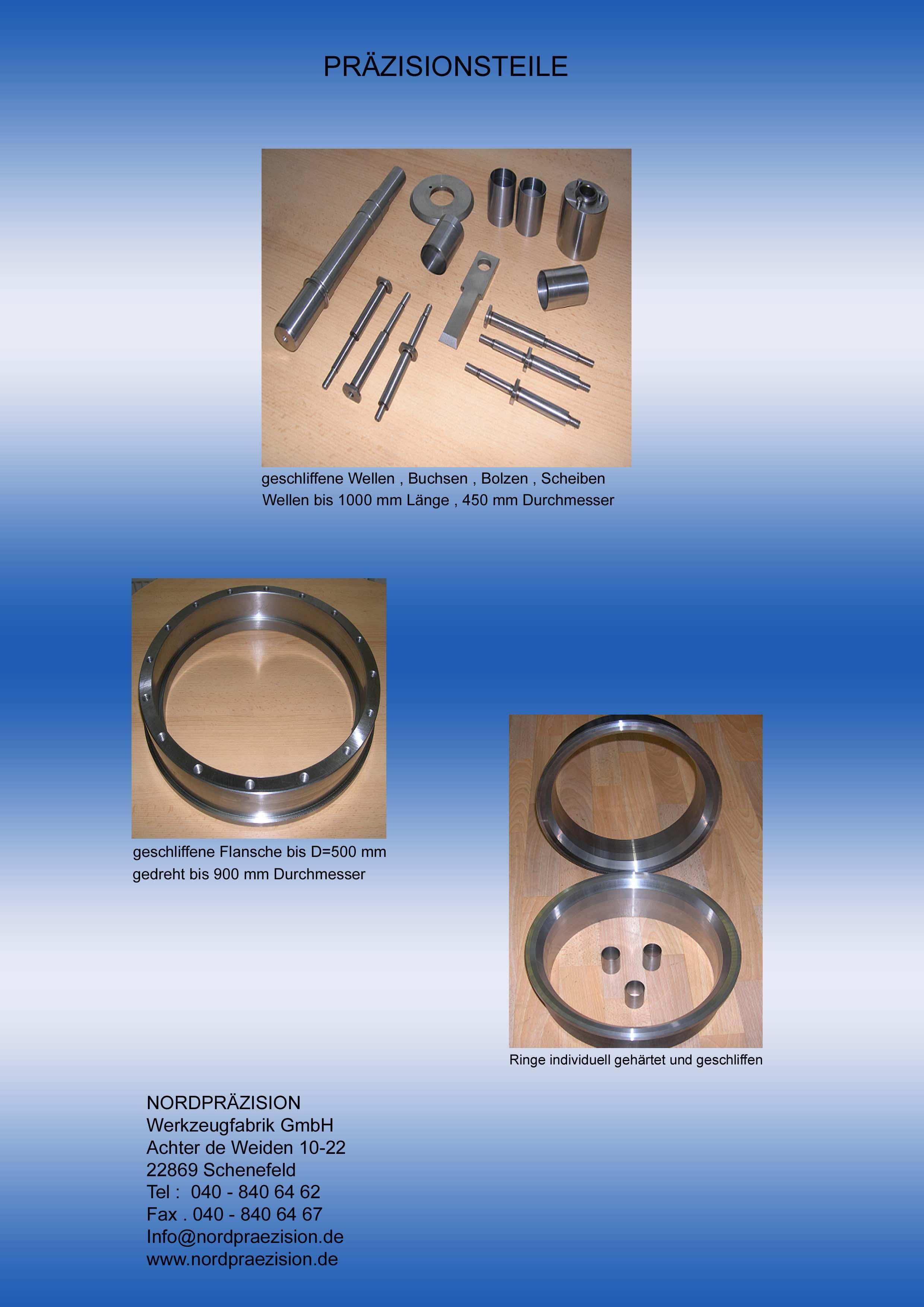 PRÄZISIONSTEILE Geschliffene Frästeile, Drehteile, Laserteile, Erodierteile. Herstellung von Messerwellen, Kreismesser, Rundmesser, Bolzen, Buchsen, Distanzscheiben, Führungsplatten, Schneidwalzen, Arbeitsplatten. Messer für die Industrie Maschinenmesser. Hartmetall Bauteile. Erodieren und Schleifen. MESSER -und Stanzwerkzeugbau Messer für die Industrie Industriemesser, Kreismesser, Rundmesser, Perforiermesser, Folienmesser, Scherenmesser, Rollscherenmesser, Rotormesser, Mühlenmesser, Schneidwalzen, Schreddermesser, Hartmetallmesser und Industrieklingen nach Zeichnung. FÜHRUNGSLEISTEN Fertigung von geschliffenen Führungsschienen, Schneidleisten (Messerleisten), Scherenmesser, Langmesser, Querschneidemesser, Schlagscherenmesser. Hartmetall - Präzisionsteile Hartmetall - Teile und Hartmetallbearbeitung durch Schleifen und Erodieren. Hartmetallwerkzeuge und Hartmetallmesser nach Zeichnung. Hartmetall - Buchsen und Ringe. Stanzwerkzeuge Stanz- und Folgewerkzeuge, Lochwerkzeuge, Stanzmesser, und Stanzeisen nach Zeichnung. Stempel- und Matrizen. Biegewerkzeuge. Fertigung und Nachschleifen. Schleifen Flachschleifen, Rundschleifen, Innenschleifen, Werkzeugschleifen, Wendeplatten Schleifen, Hartmetall -Schleifen. Werkzeugschleifen: Schneidwerkzeuge Schleifen, Hartmetallwerkzeuge schleifen, Stanzwerkzeuge Schleifen NORDPRÄZISION Werkzeugfabrik GmbH (Schenefeld bei Hamburg ) info@nordpraezision.de http://www.nordpraezision.de http://www.maschinenmesser.de http://www.hartmetallteile.de