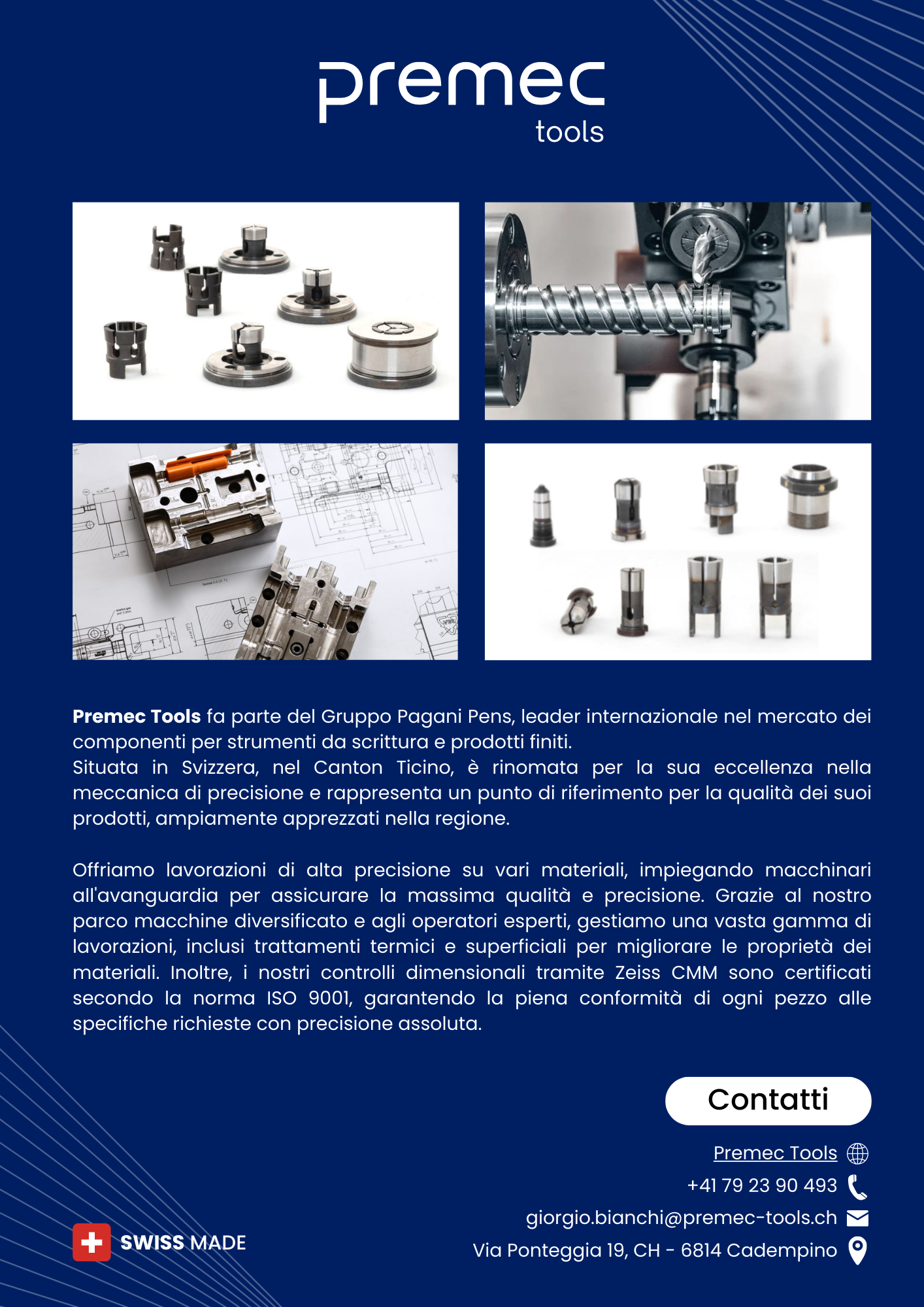 Premec Tools mit Sitz im Kanton Tessin verfügt über ein technisches Büro für Maschinenbau und eine feinmechanische Werkstatt, die mit zwei 3-Achsen- und 4-Achsen-CNC-Bearbeitungszentren, einer CNC-Drehmaschine, einer CNC-Schleifmaschine für den Innen- und Außenbereich, traditionellen Drehmaschinen, Fräsmaschinen und Schleifmaschinen sowie zwei CNC-Taucherosionen ausgestattet ist. Premec Tools kann seine Fähigkeiten Unternehmen bei der Entwicklung und Herstellung von Präzisionsprototypen aus verschiedenen Materialien zur Verfügung stellen, die in allen Industriebereichen zum Einsatz kommen. Struktur, Systeme und Ressourcen machen Premec Tools zu einem zuverlässigen und flexiblen Partner für komplexe und dringende Produktionsabläufe. Premec Werkzeuge Präzisionswerkzeuge für mehr als nur den Schreibbereich. Verfügbare Maschinen Rosa Flachschleifen 700×450 Studer Rundschleifen Ø100 L=200 Studer-Innenschleifen von Ø0,8 bis Ø120 Studer CNC-Innenschleifmaschine von Ø 0,8 bis Ø 30 L=30 => ØE40 L=120 Studer CNC-Innenschleifmaschine von Ø 4,0 bis Ø 150 L=400 Biglia CNC-Drehmaschine Ø150 L=500 Biglia Drehmaschine CNC Ø150 L=500 mit Ladestange CB Ferrari 4-Achsen-CNC-Bearbeitungszentren, programmierbar mit CAD-CAM 1100×660 h660 Digma Hochgeschwindigkeits-Bearbeitungszentrum, programmierbar mit CAD-CAM Agie EDM Funkenerosionsbearbeitung Sigma Laserschweißgerät Lasergravur Zeiss Koordinatenmessgeräte (CMM) Entdecken Sie, wie wir unsere Präzisionswerkzeuge, unser technisches Büro und unsere Werkstatt für Sie einsetzen können. Kontaktieren Sie uns