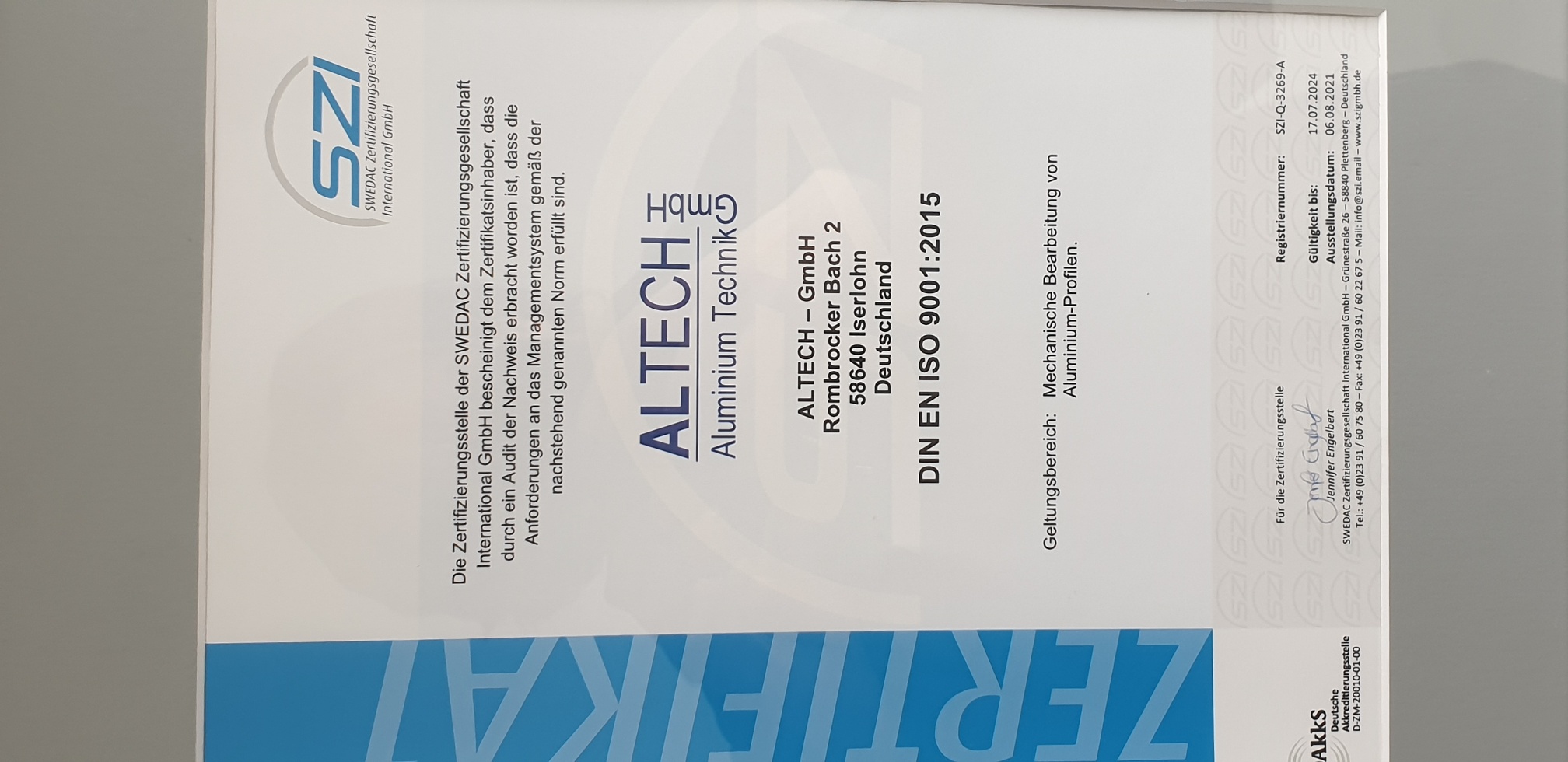 About us ALTECH Aluminum technology Since 2004, we have been on the market with experienced experts from the aluminum sector. Our 15 employees ensure on-time deliveries. As former employees of a large international corporation, we are familiar with modern management methods such as: TQM, safety standards, production systems, etc., and are an important part of our corporate strategy. We offer the following processing options: Sawing and punching aluminum profiles of at least 10 mm to a maximum of 6,000 mm in length with saw tolerances of up to +/- 0.1 mm. CNC processing on three machining centers in accordance with the service catalog Additional requirements upon request. Delivery options: Complete aluminum solutions from a single source. The customer determines the scope of delivery, including surface finishing, anodizing, sandblasting, chemical glossing, powder coating, lettering and foiling. customer service: Quality, customer service, maximum flexibility, delivery reliability and reasonable prices are our most important corporate goals. We are looking forward to your inquiries
