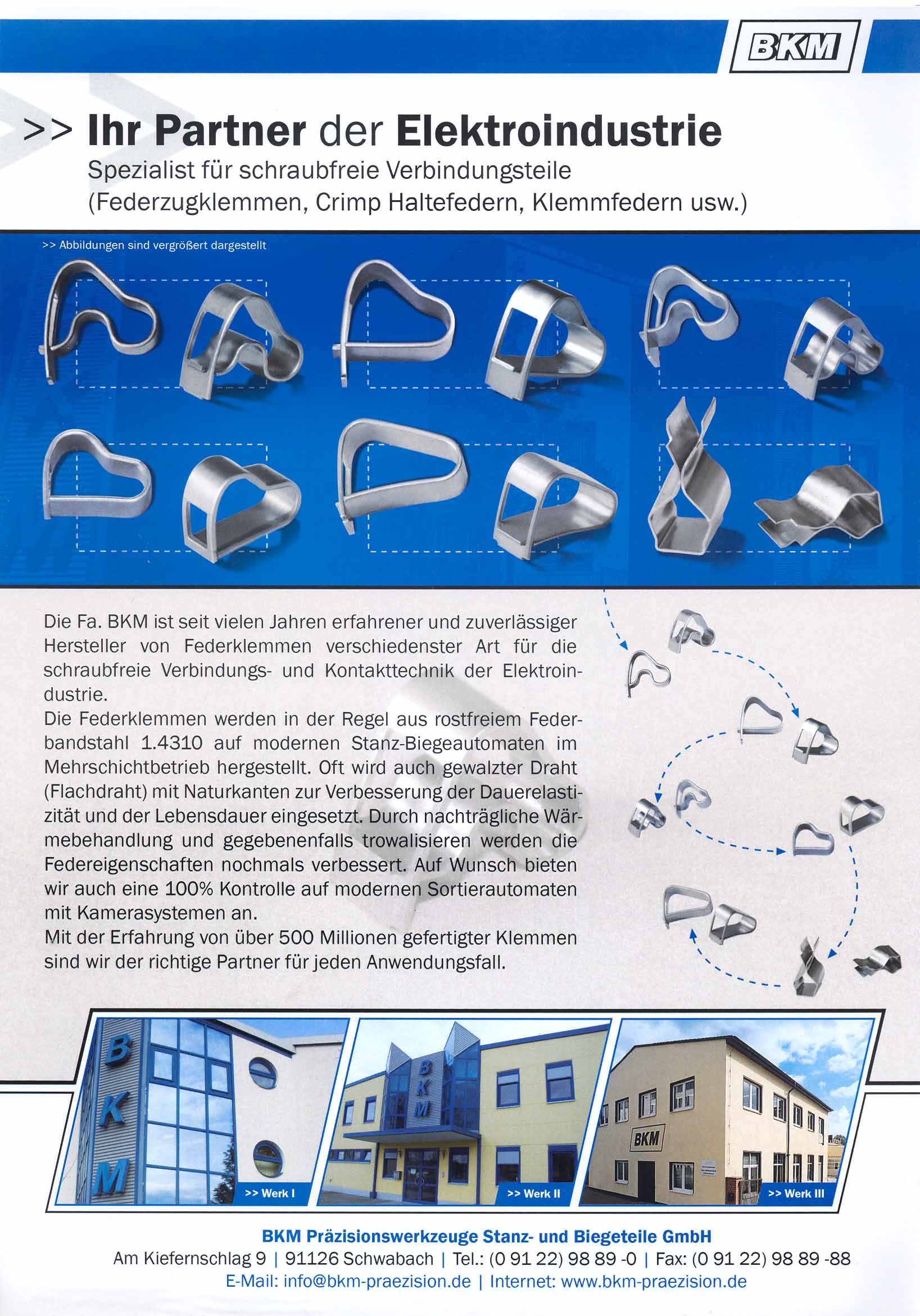 The BKM precision tools, punching and bending parts GmbH was founded in 1977 and stands below with you: 1) Products: - Leaf Spring / keys springs - Connection, threaded and welded parts - Stamping and bending parts - Contact parts and springs, with or without rivet - Wire parts - Spring-loaded terminals and special bending springs - Coal guidance / mounting hardware (mounting small components.) 2) Dimensions: - Material thickness: Band 0.05 to 5 mm - Wire Ø 0.1 to 6 mm - Lengths up to 400 mm 3) Materials: - St-material - Carbon steel - Stainless steel (1.4310/1.4301) - Non-ferrous metal (bronze, brass, copper) - Special alloys 4) finishing: - Harden, even bainitic - Case hardened - Surface treatment (Vibratory grinding / polishing / start) - Galvanic surfaces 5) Industries: - Automotive - Electrical industry - Household appliances - Entertainment Electrical - Toys and Leisure Industry - Medical - Solar 6) departments / facilities: - Construction (development) - Tool (also prototype) - Presses with up to 125 tons. - Punching and bending machines up to 25 tons. (Bihler, Wafios) - Tempering - Trowalanlagen - Sorting by a camera system 7) Certifications: - Certified according to ISO 9001:2008 and QuH (Environment) - TS 16949 in preparation "All in one" is the motto of our house. Already on offer stage, we can provide valuable recommendations to product improvements or cost reductions by simplifying the design, appropriate material selection or tolerance definition you our years of experience. More than 100 competent and committed employees in management, engineering, tooling, manufacturing and quality assurance take care of the optimal realization of your wishes. Corporate objectives BKM has been successful for over 30 years in the field punching, bending and contact parts, leaf springs and wire form parts operate. Our business goals are * Customer Satisfaction * Motivated and satisfied employees * Latest Technology * Expansion of market shares and * Protecting the environment