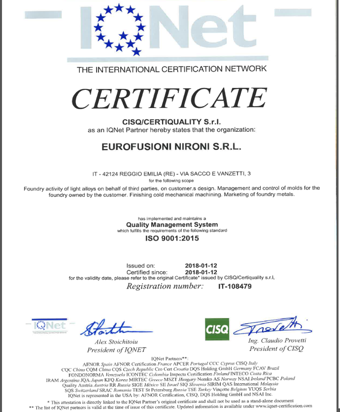 In the 1950s the family Nironi started the first production activities in the die-casting industry, collecting until today more than 60 years of expertise in the field. In 1998 the son Stefano Nironi decided to move to the next level by specializing in aluminium pressure die-casting. 1998 – Foundation of Eurofusioni Nironi S.r.l. 2011 – Beginning of CNC machining production 2012 – Beginning of CNC Turning production 2014 – Presentation of new Overlying Cycle technology at Euroguss trade fair 2016 – Euroguss trade fair and initial export activities to Germany 2017 – Renovation of entire production site 2018 – Certification ISO 9001 and purchase of 2nd hybrid machine 580T for Overlying Cycle 2020 – Programmed purchase of 3rd hybrid machine 900T for Overlying Cycle technology