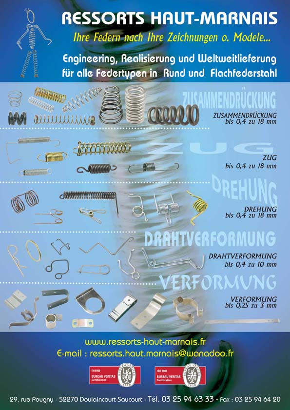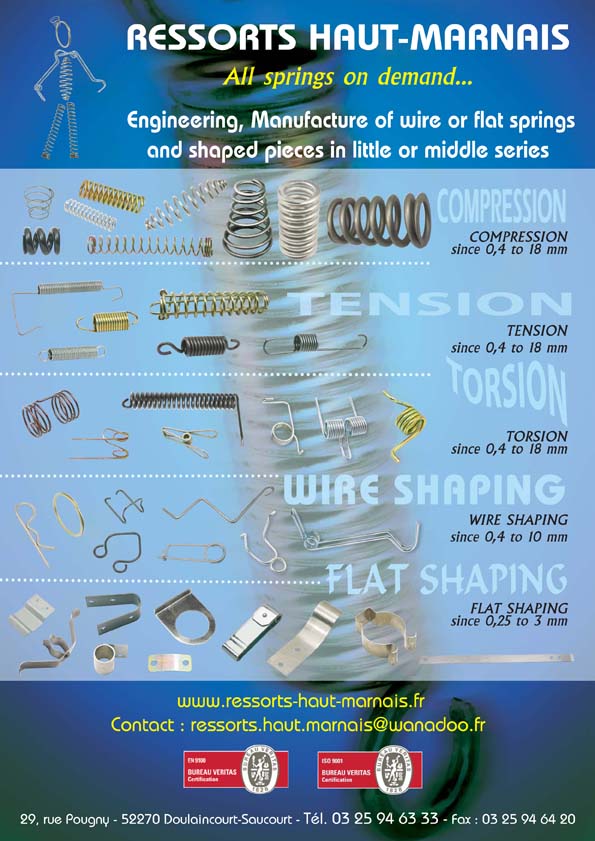 We manufacture springs and pieces in wire from 0.4 to 18 mm and flat width 0.3 to 3 mm, in little and middle series. We are equipped with recent machines and have an important stock of raw material which allows us to answer to demands very quickly. We are certificated according to ISO 9001 and EN 9100 and all our processes are controlled by computer .