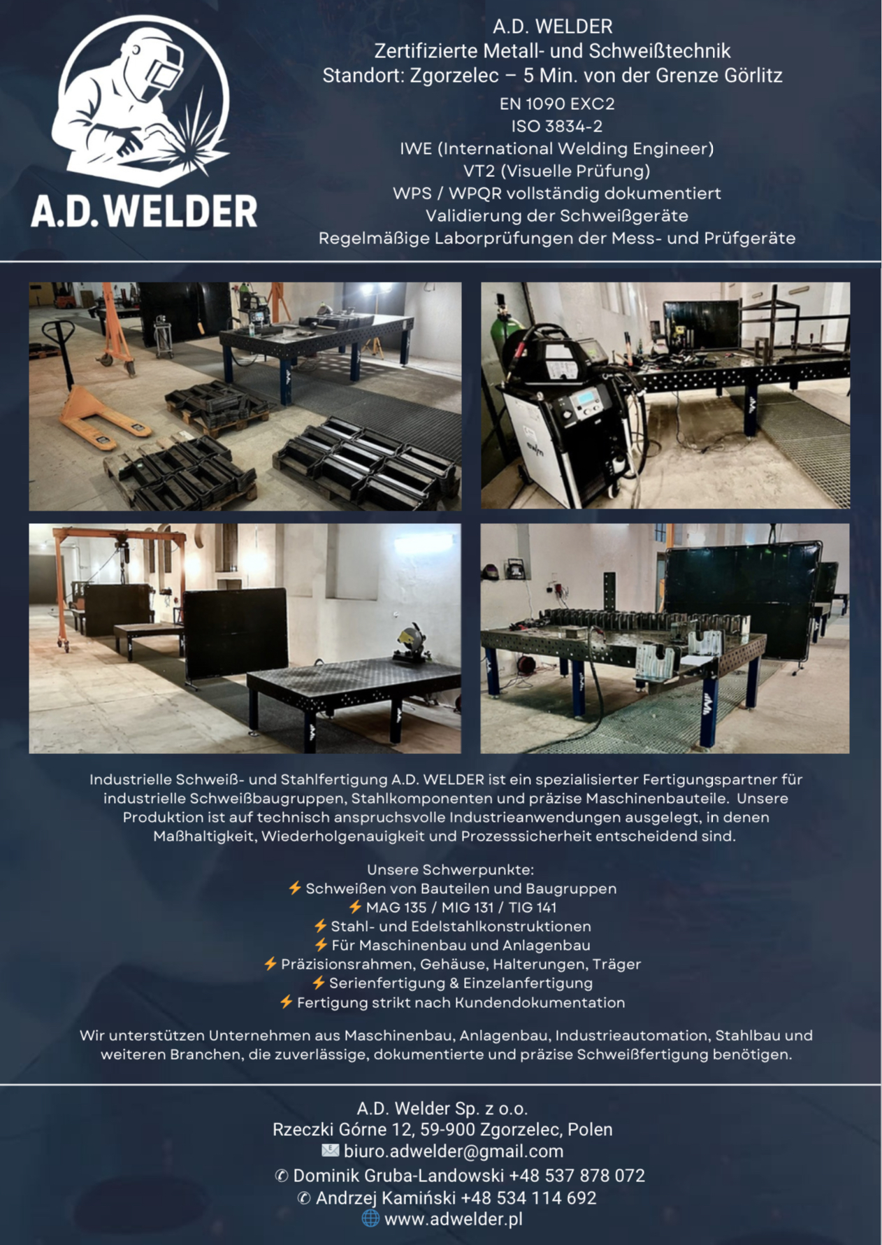 A.D Welder è un’azienda certificata di saldatura e carpenteria metallica con sede a Zgorzelec, in Polonia – direttamente al confine con Görlitz (Germania). Grazie alla nostra posizione al confine tedesco-polacco, offriamo ai clienti in Germania e in tutta l’UE tempi di consegna brevi, comunicazione rapida e prezzi molto competitivi. Produciamo strutture e gruppi saldati in acciaio per la costruzione di macchine in generale, macchine speciali, impianti industriali, nonché per macchine edili e agricole. I prodotti tipici includono telai, basamenti, supporti, travi, piattaforme, staffe, ringhiere e altri componenti strutturali realizzati secondo i disegni del cliente. La nostra produzione segue elevati standard di qualità e disponiamo delle seguenti certificazioni: EN 1090 EXC2 e ISO 3834-2 per la saldatura di strutture in acciaio. Lavoriamo principalmente acciai da costruzione e acciaio inox in piccole, medie e anche grandi serie, oltre che per pezzi singoli. I nostri punti di forza sono percorsi decisionali brevi, contatto diretto con il titolare e un’elevata flessibilità in termini di tempi di consegna e dimensioni dei lotti. Siamo pronti a supportarvi come partner affidabile di produzione – dal prototipo fino alla produzione in serie.