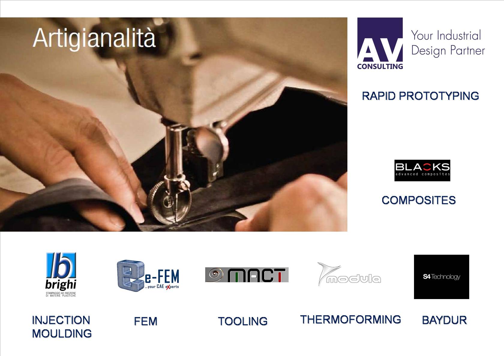 AV Consulting founded in 2008 a division dedicated to INDUSTRIAL DESIGN RAPID PROTOTYPING, LOW VOLUME PRODUCTION, SERIAL PRODUCTION. In 10 years of activity this structure has reached a strategic position to serve not only Italian but also European clients. According to the components to be produced, technical specifications, cost targets, production volumes, AV Consulting chose the correct mix between MATERIALS and PRODUCTION TECHNOLOGIES. 7 production plants in Italy between Marche and Emilia Romagna and three partners in France and in China allow us to manage prototypes, small productions and mass production. POLIURETHANE, INJECTION MOULDING, TERMOFORMING, CARBON, COMPOSITES, RAPID PROTOTYPING.