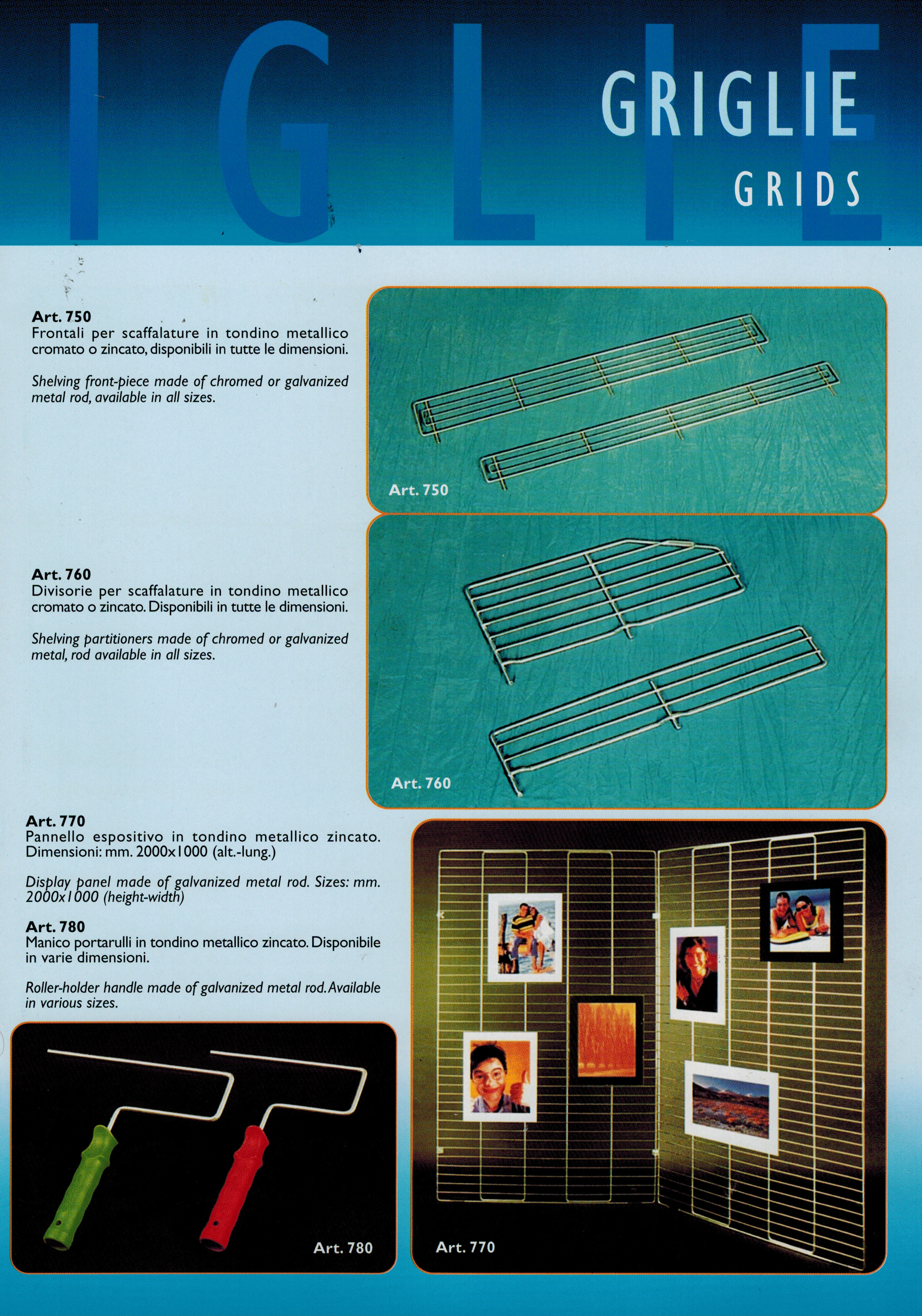 La BLG produce griglie, espositori in tondino elettrosaldato in vari modelli e dimensioni, ad uso commerciale ed industriale. La flessibilità produttiva è uno dei punti forza dell'azienda: è possibile fornire prodotti a disegno. I prodotti trovano applicazione in numerosi settori : griglie per supermercati,ceste ad uso commerciale ed artigianale, griglie per elettrodomestici, ecc. Diametro tondino da 2 mm a 10 mm