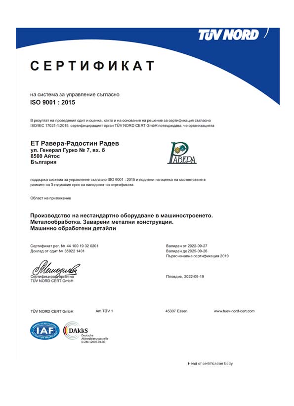 L'inizio Fondata dall'Ing. Radostin Radev, «Ravera» ha avviato le sue attività specializzandosi nella produzione di componenti metallici standard e personalizzati. 2001 | Espansione strategica Spinta da una base clienti in crescita e dall'espansione delle operazioni, l'azienda ha acquisito terreni per iniziare la costruzione di un moderno impianto di produzione dedicato. 2005 | Nuova sede L'azienda si è trasferita ufficialmente nella nuova sede e base di produzione situata nel distretto del quinto chilometro, a Burgas, fornendo l'infrastruttura necessaria per le operazioni industriali su larga scala. 2007 | Salto tecnologico Per stare al passo con le tendenze globali dell'ingegneria meccanica, «Ravera» ha implementato con successo il suo primo progetto UE nell'ambito del programma «Competitività e innovazione nelle imprese». Ciò ha portato all'acquisizione di un centro di tornio universale CNC Spinner TC800-110 ad alta precisione, segnando l'inizio della nostra era della produzione digitale. 2010 | Garanzia di qualità Con l'ampliamento della nostra rete internazionale di partner, l'azienda ha istituito un laboratorio di metrologia e misurazione all'avanguardia. Ciò ha garantito che ogni componente soddisfi i più elevati standard internazionali di qualità. 2010 — Presente | Innovazione continua «Ravera» continua a investire molto nell'espansione degli impianti e nell'ammodernamento dei macchinari. Attraverso la gestione di successo di diversi progetti finanziati dall'UE, abbiamo consolidato la nostra reputazione di partner affidabile e preferito nel settore europeo dell'ingegneria meccanica.